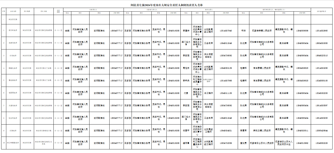 阿拉善左旗水務(wù)局關(guān)于《2026年度水庫(kù)大壩安全責(zé)任人和防汛責(zé)任人名單》的公示